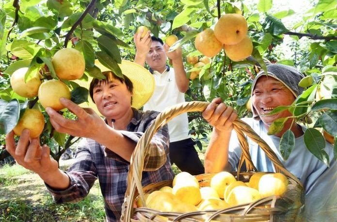 图为上饶市广丰区吴村镇塘边村果农正在采摘天桂梨。(图/中新网)