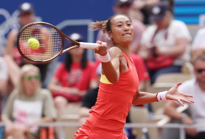 8月3日,郑钦文在比赛中回球。(图/新华社)