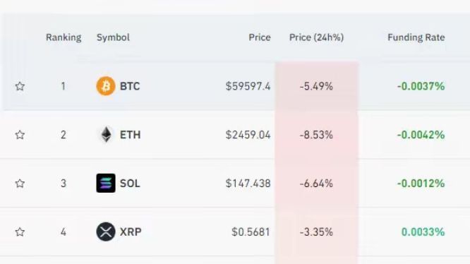 比特币一度下跌逾6%,截至发稿报59597.4美元。以太币一度重挫逾7%。