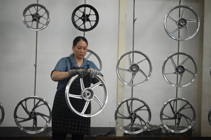 7月9日,位于重庆市垫江县的重庆捷力轮毂制造有限公司的生产车间内,工人正在处理摩托车轮毂。(图/中新社)