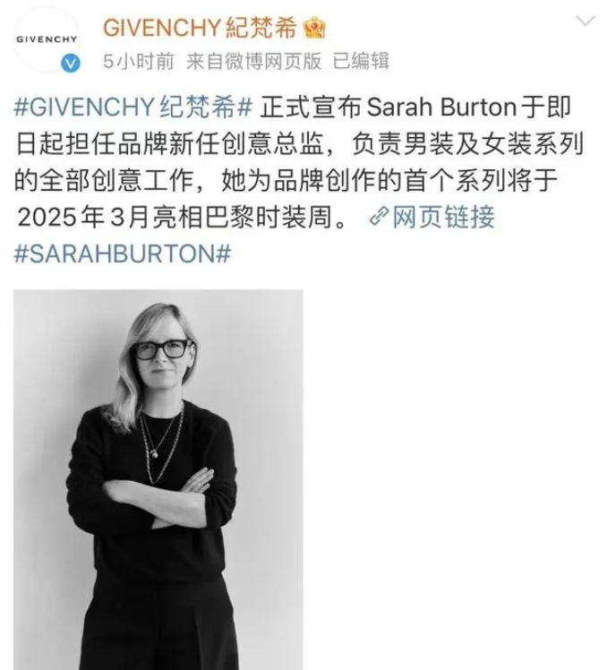 9日,LVMH旗下Givench纪梵希宣布挖来了竞争对手开云集团旗下Alexander McQueen的创意总监Sarah Burton。(图/Givench纪梵希官方社交平台微博截图)