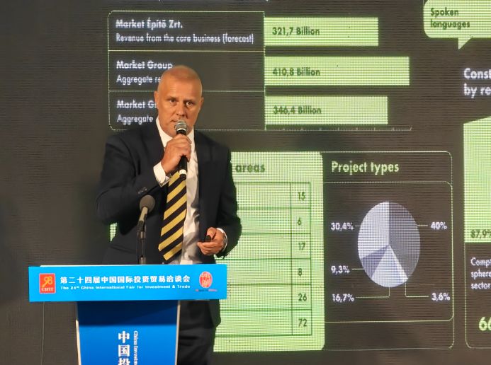 图为来自匈牙利的Market建筑公司商务总监亚诺什·苏葛正在介绍该公司情况。(图/中新社)