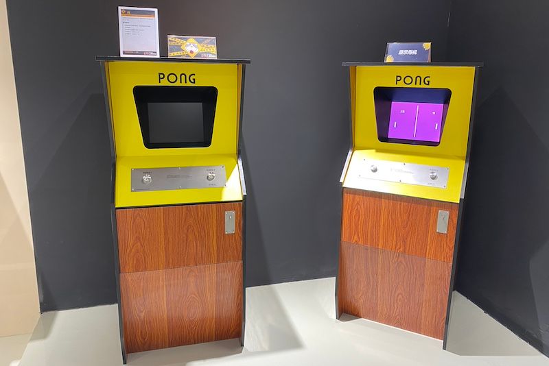 最早的电子游戏主要是模仿体育运动和棋类游戏。1972年11月29日在美国上市的街机游戏《乓》大获成功,它是模仿乒乓球的双人对战游戏。原型机在一家酒馆里测试时,没几天就坏了,原来是硬币已经塞满了,可见有多受欢迎,其成功验证了电子游戏的商业潜力。展馆内设置了两台《乓》街机体验机,供观众试玩。