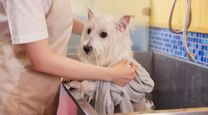 在菏泽市巨野县城市社区一家宠物服务室,工作人员正在给宠物洗护。(图/中新网)