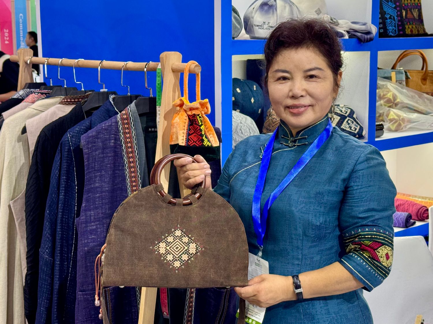 10月13日,来自海南的琴韵幽兰品牌设计师王彬妮展示黎锦元素面料制成的产品。(图/中新社)