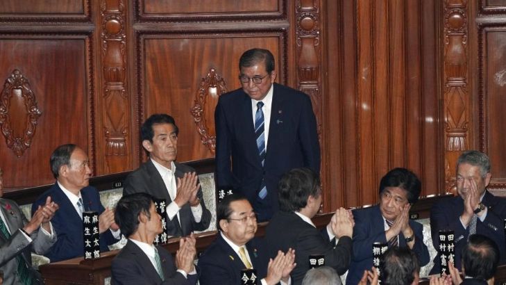资料图:10月1日,在位于日本东京的日本国会众议院举行的首相指名选举中,石破茂起身致谢。(图/新华社)