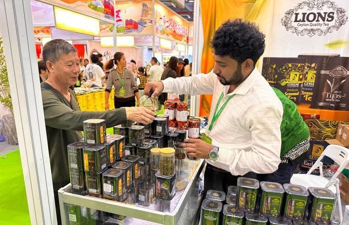 第十六届海峡两岸茶业博览会在福建省武夷山市举办,游客正在“一带一路”国际茶产品展区选购产品。(图/中新网)