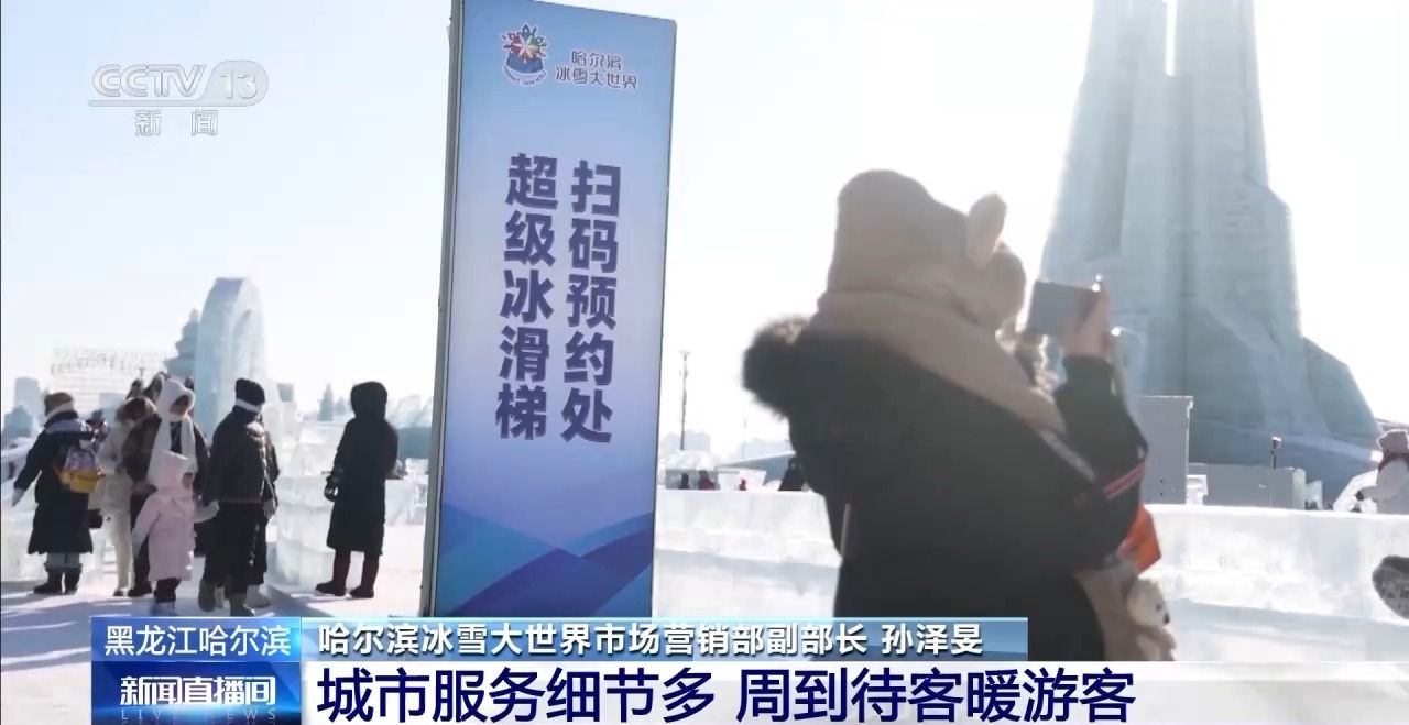 哈尔滨冰雪大世界市场营销部副部长孙泽旻:今年我们也把单纯的排队改成了预约的形式,您提前预约好后,可以在规定的时间去乘坐超级冰滑梯,可以有效节约游客排队的时间,排队区也修建了暖廊。