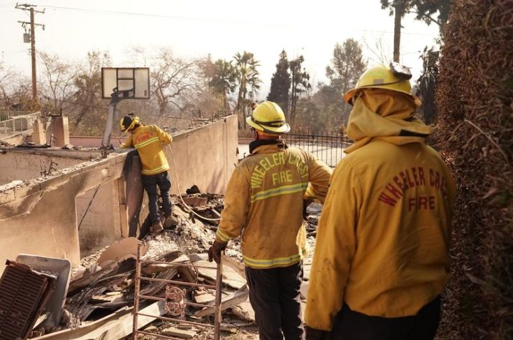 1月10日,在美国加利福尼亚州洛杉矶县阿尔塔迪纳地区,消防员正在努力扑灭山火过后建筑周围的热点区域。(图/新华社)