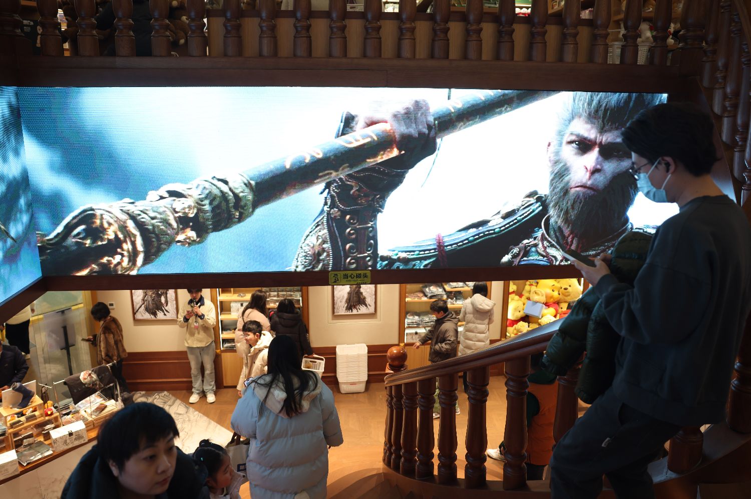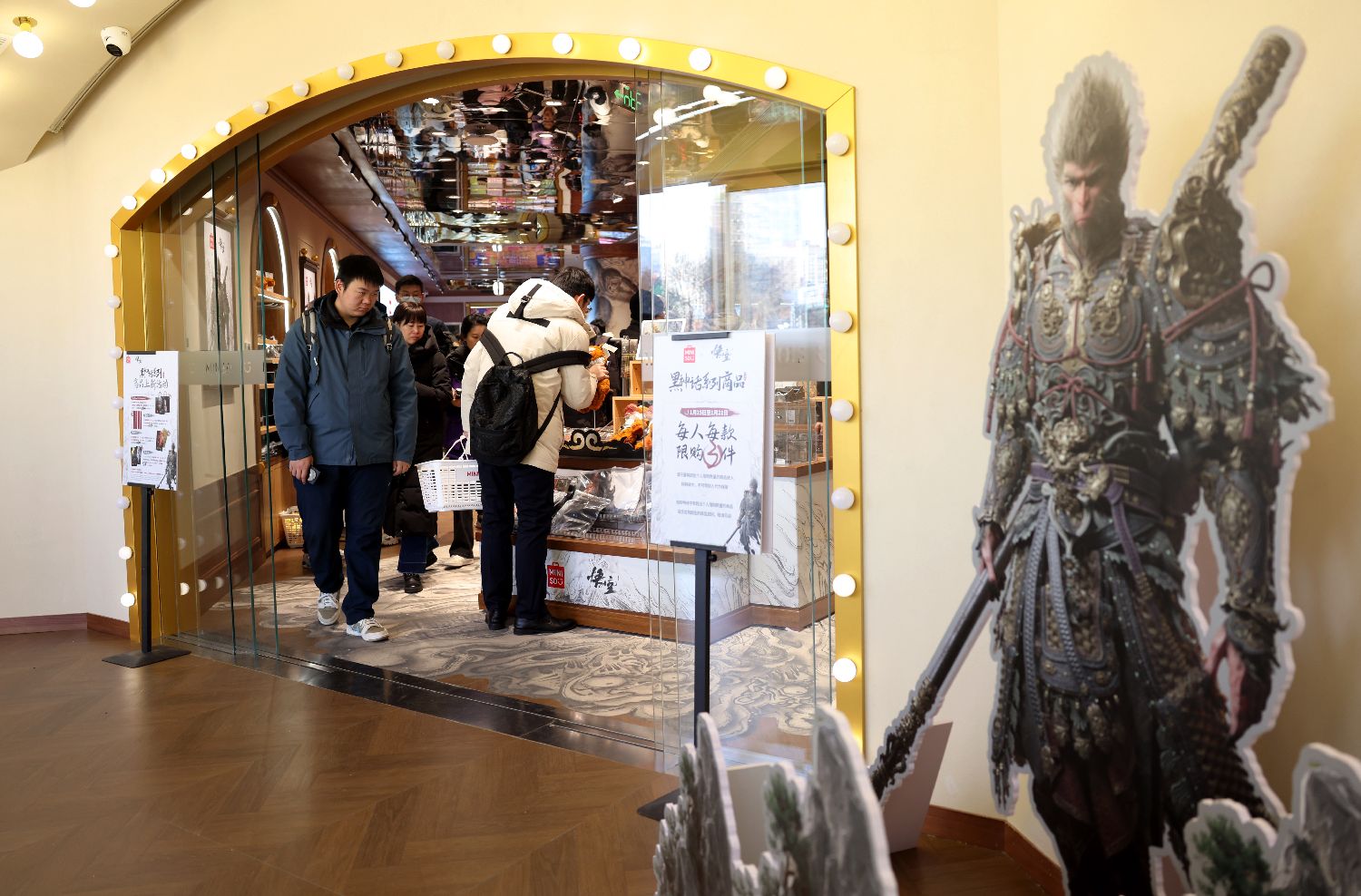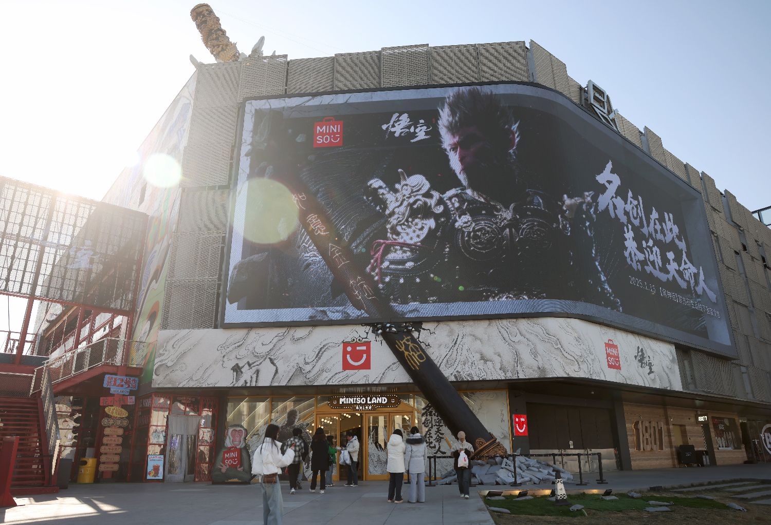 2025年1月17日,北京一家名创优品×《黑神话:悟空》联合主题店门前,3D裸眼“金箍棒穿楼”视觉效果拉满。近日,中国国产首款3A游戏《黑神话:悟空》与名创优品联合主题店在北京开幕,黑神话官方衍生品牌“黑神话BLACKMYTH”在名创优品北京等地门店首发,名创优品官宣成为黑神话官方衍生品牌全球线下独家发售渠道。该店《黑神话:悟空》衍生品牌相关商品被摆在了入口处最显眼的位置。游戏角色毛绒玩具、徽章、袜子、配饰等丰富的商品,以及联名赠品周边,掀起“天命人”(即《黑神话:悟空》游戏玩家)们的抢购热潮。(图/卞亚文)
