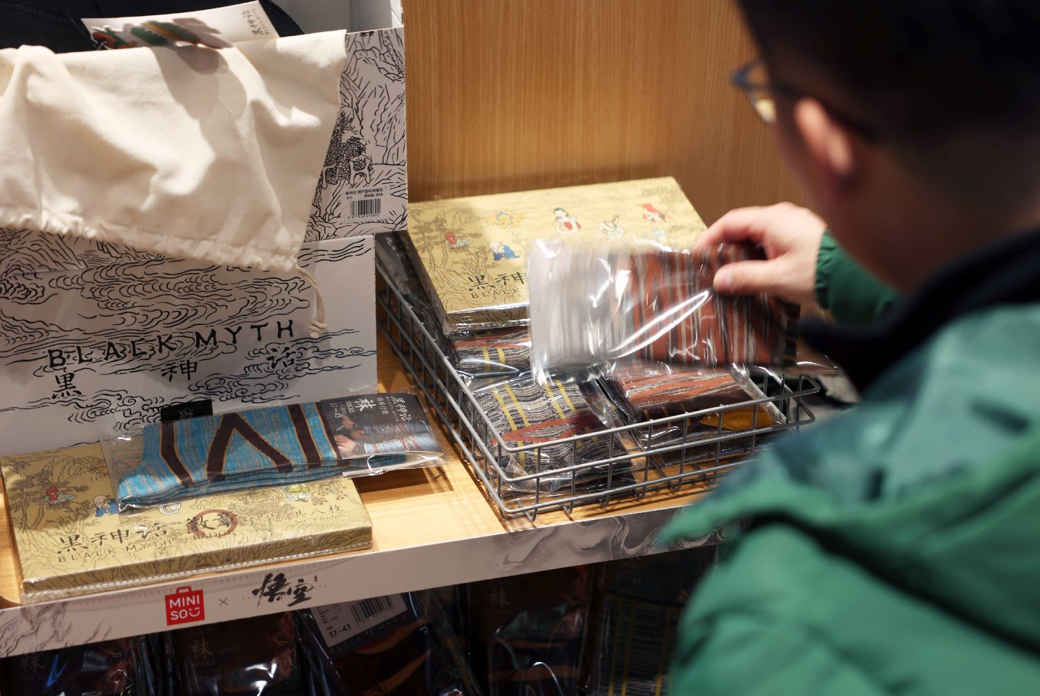 近日,中国国产首款3A游戏《黑神话:悟空》与名创优品联合主题店在北京开幕,黑神话官方衍生品牌“黑神话BLACKMYTH”在名创优品北京等地门店首发。游戏角色毛绒玩具、徽章、袜子、配饰等丰富的商品,以及联名赠品周边,掀起“天命人”(即《黑神话:悟空》游戏玩家)们的抢购热潮。
