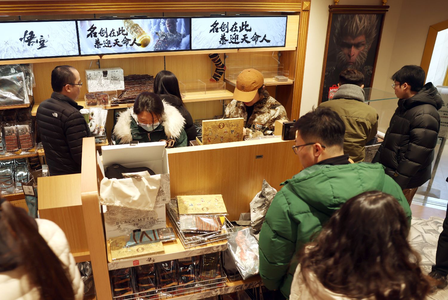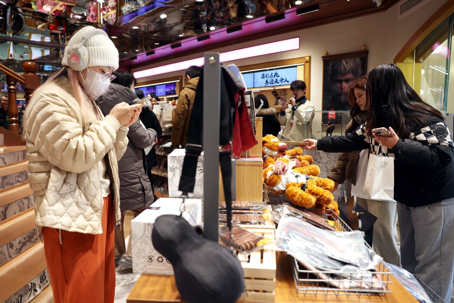 2025年1月17日,北京一家《黑神话:悟空》联合主题店发售周边产品,吸引众多游戏玩家购买。(图/卞亚文)