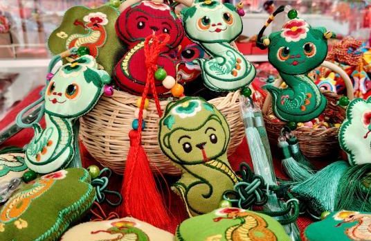 1月17日,甘肃庆阳市,绣娘们制作的蛇元素新春香包。(图/中新网)