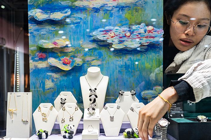 图为一家香港展商展出的“熊猫与竹”系列珠宝。(图/中新社)