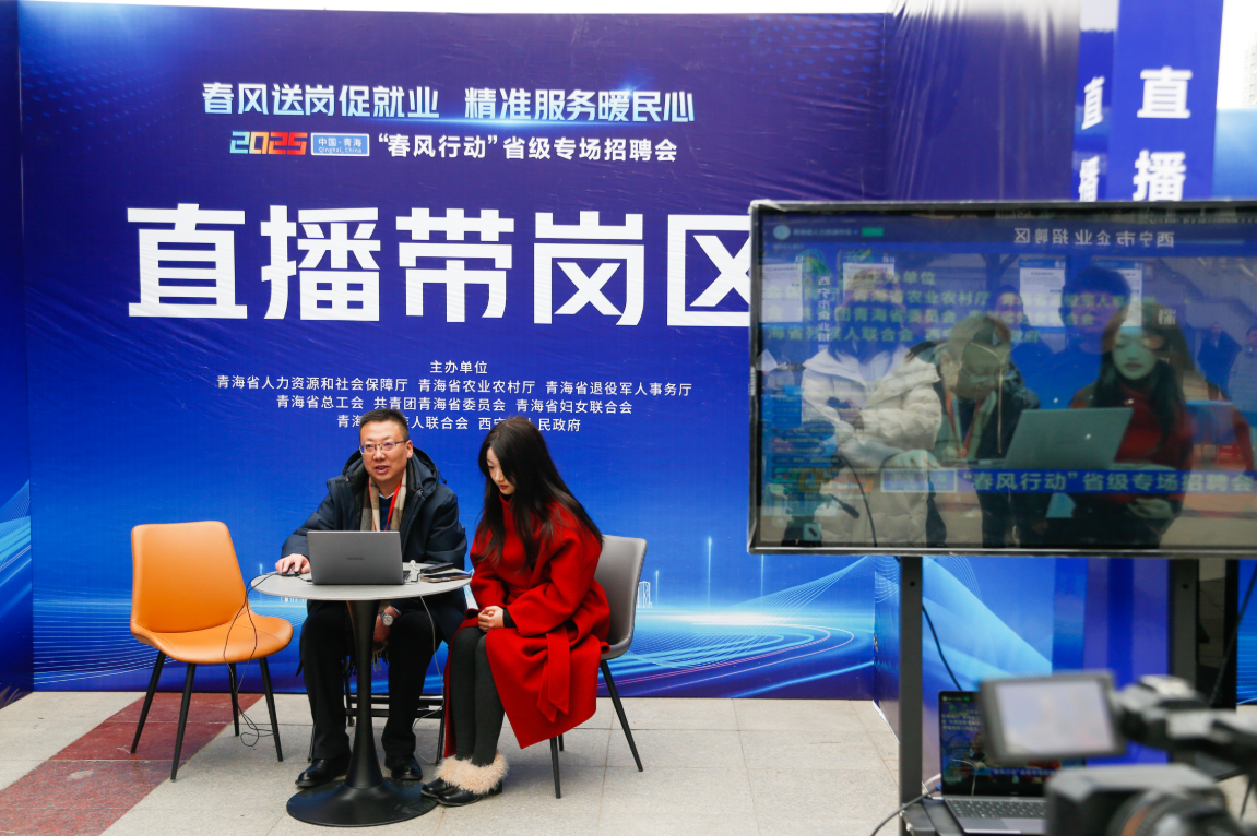 资料图:图为3月1日,2025年青海省“春风行动”省级专场招聘会现场设置的直播带岗区。(图/中新社)