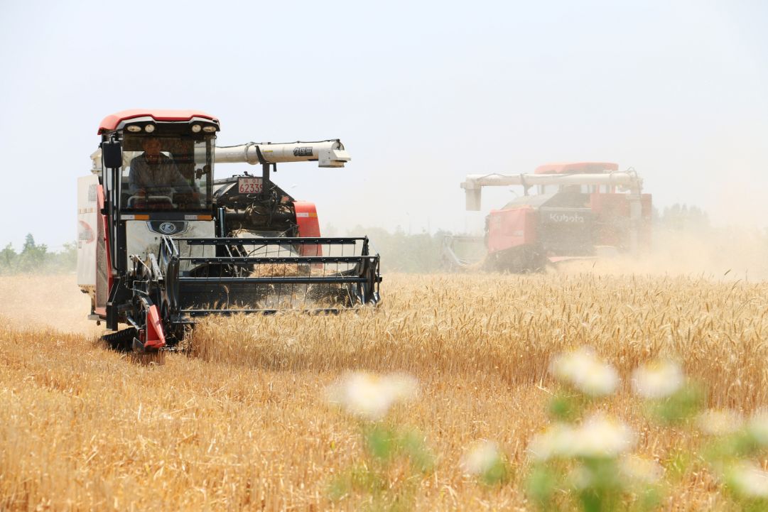 2024年5月25日,在安徽省肥西县上派镇谢塘社区,农机手驾驶农机抢收小麦。(图/中新社)