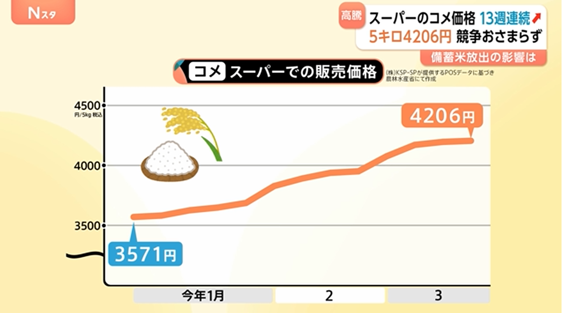 日本农林水产省最新数据显示,截至3月底,全国超市大米平均售价已连续13周上涨,5公斤装均价达4206日元,较去年同期翻倍,创历史新高。