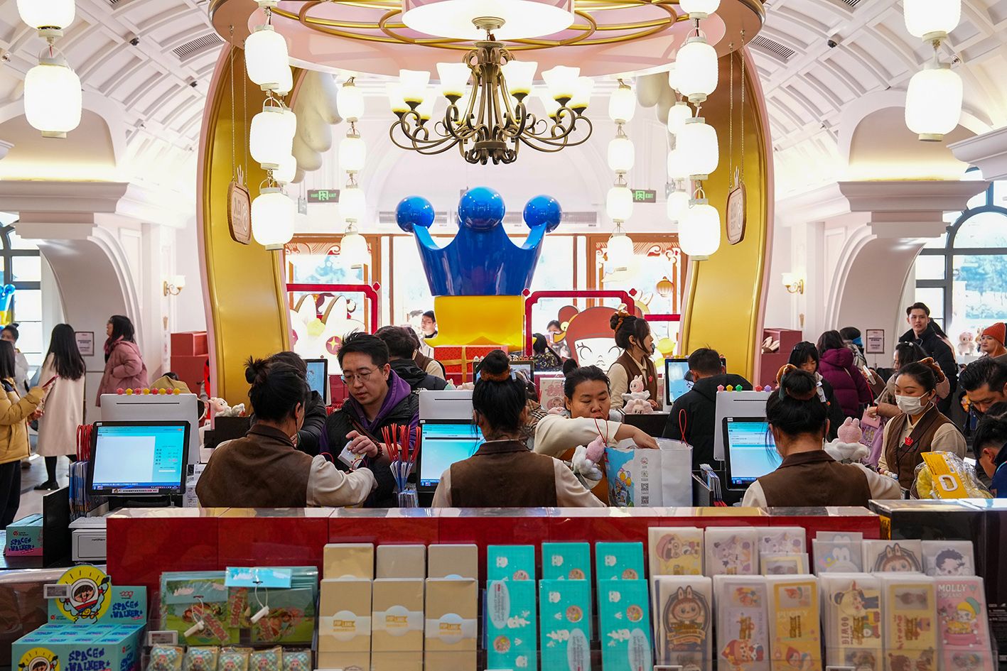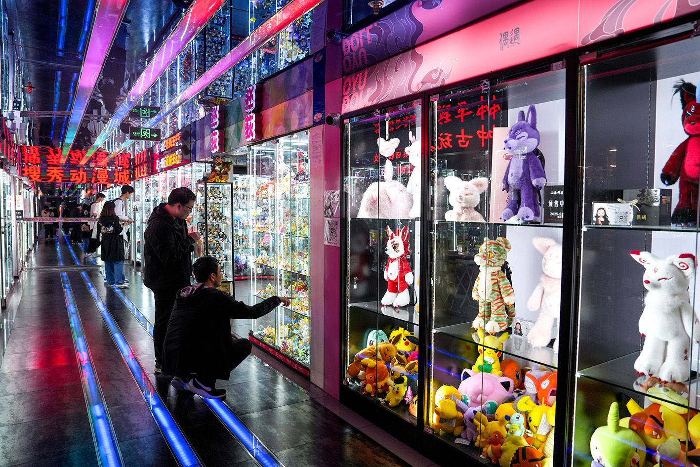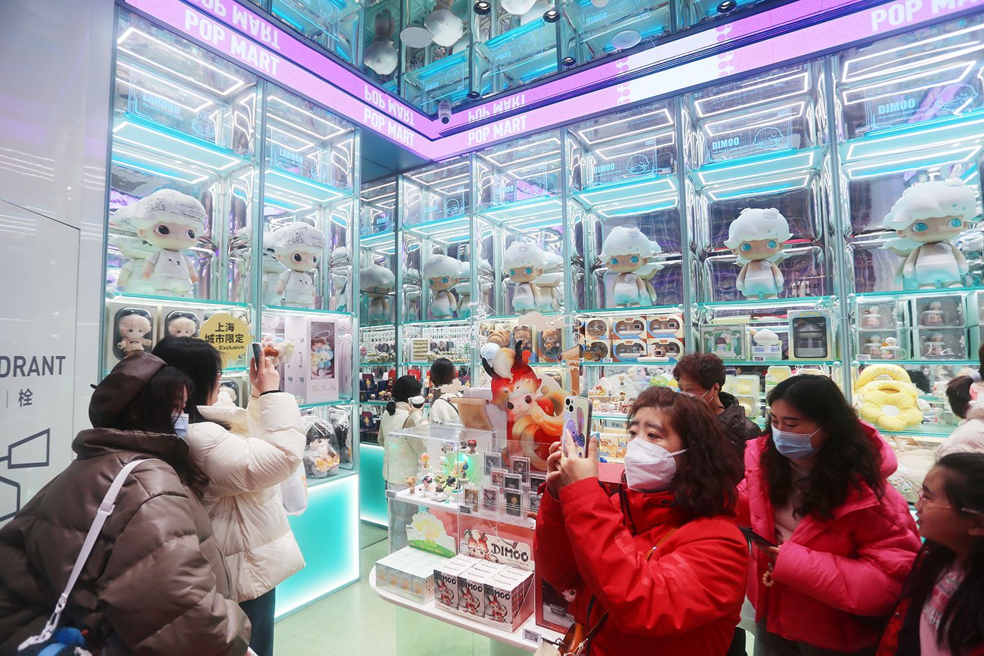 上海,二次元“谷子经济”地标——潮玩盲盒品牌泡泡玛特(POP MART)全球最大旗舰店。(中新社)