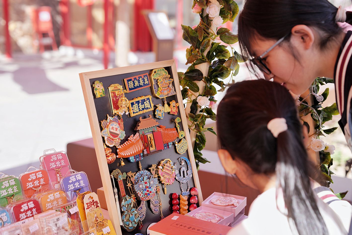 4月4日,三山五园文化市集在北京同庆街开市,特色摊位沿街铺展,在清明假期为民众带来沉浸式文化体验。图为三山五园文创产品吸引市民。(中新社)