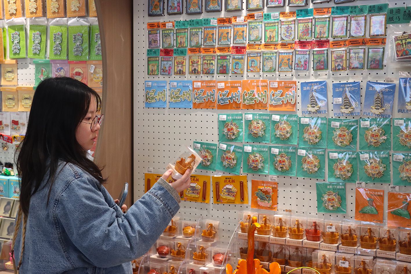 浙江瑞安忠义街,游客挑选具有地方特色的文创产品。(中新社)