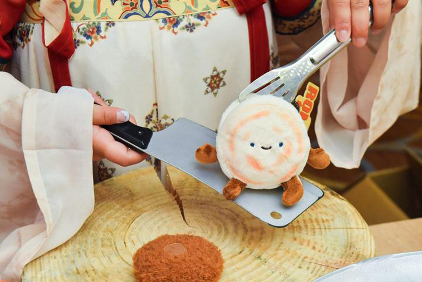 西安大雁塔脚下的大相文博潮物坊内,大相文博的工作人员为顾客打包以肉夹馍为创作灵感的“绒馍馍”。(新华社)