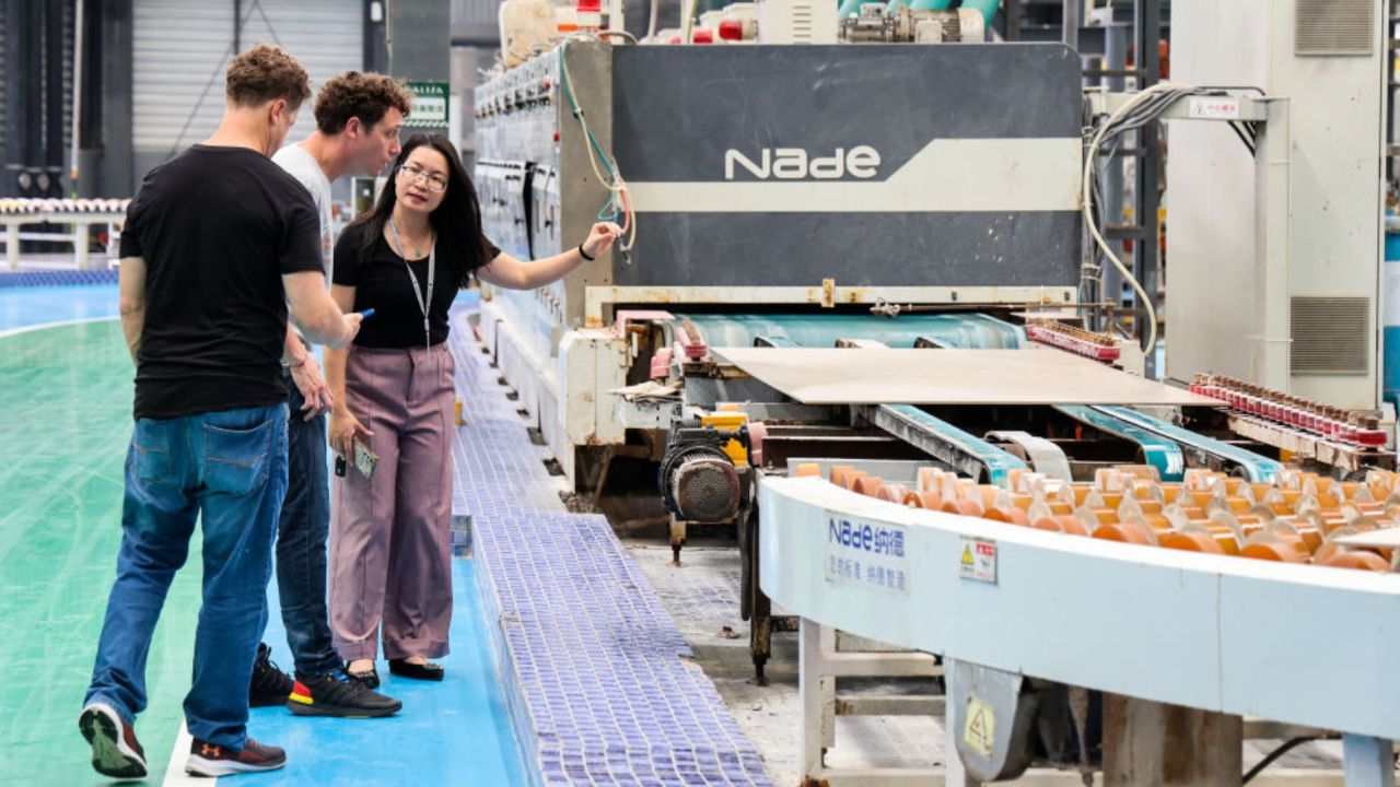 2025年4月22日,两名参加广交会的阿根廷采购商专程来到佛山参观蒙娜丽莎大尺寸陶瓷岩板自动生产线。新华社记者刘大伟摄