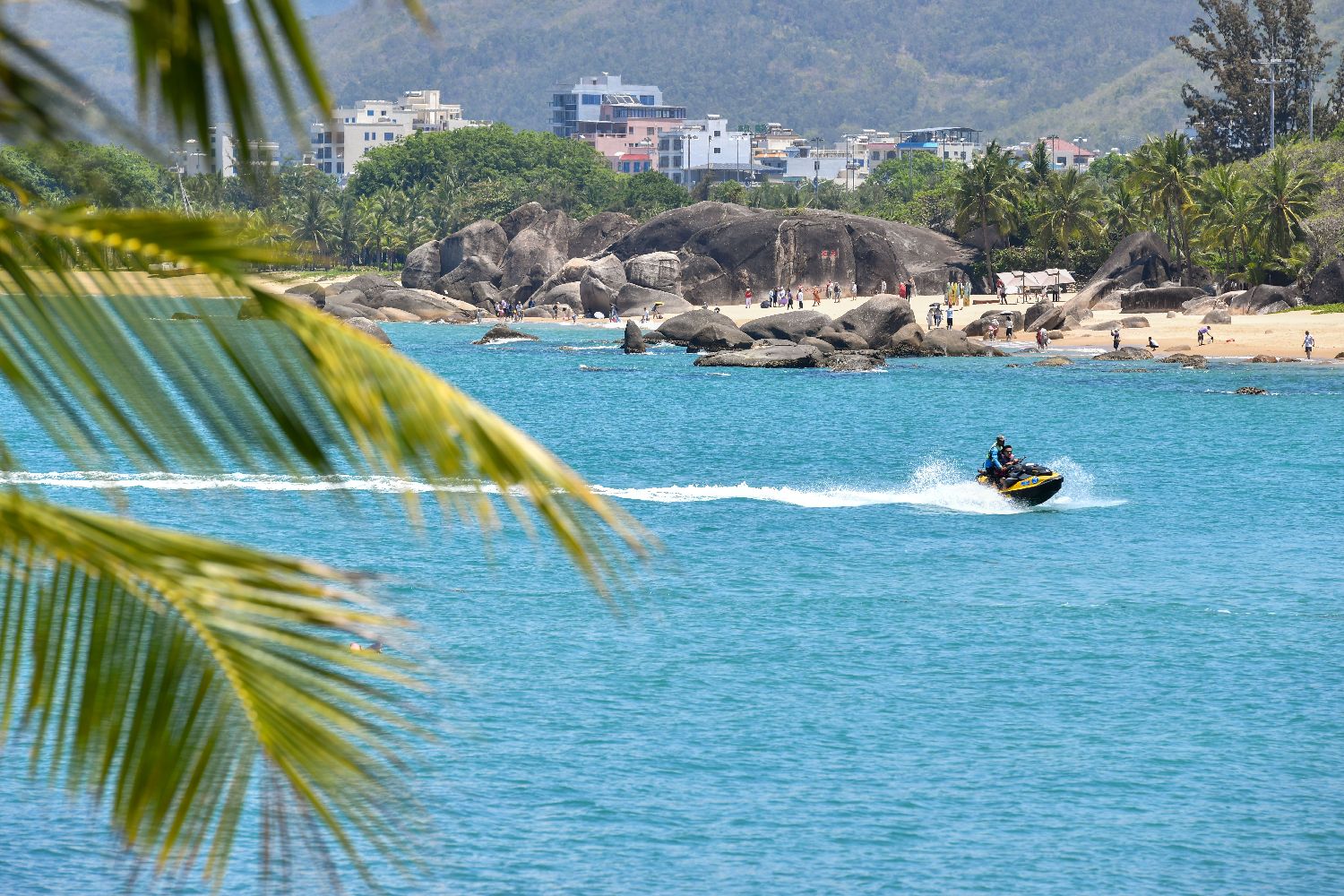 6月8日,海南三亚,游客在天涯海角游览区体验摩托艇。当日,恰逢世界海洋日,海南省三亚市天涯海角游览区迎来大批游客。蔚蓝海面,金色沙滩,游客尽情玩耍、拍摄留念,感受海洋生态的独特魅力。(图/中新社)