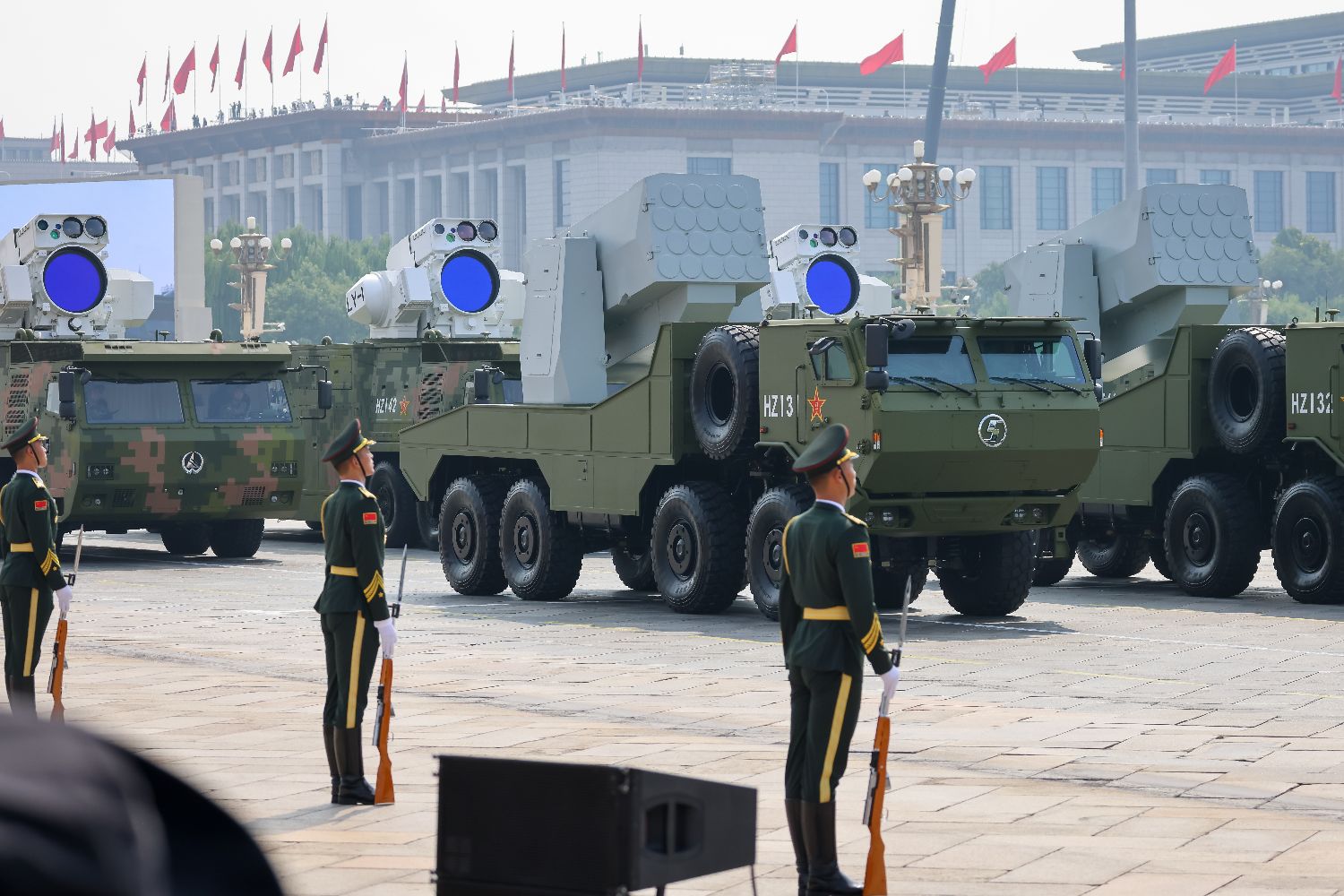 图为舰载防空武器方队接受检阅。首次亮相的舰载激光武器LY-1具备精准毁伤、持续打击的突出优势,可与其他防空武器系统协同作战,提升综合防御能力。(图/香港中通社)