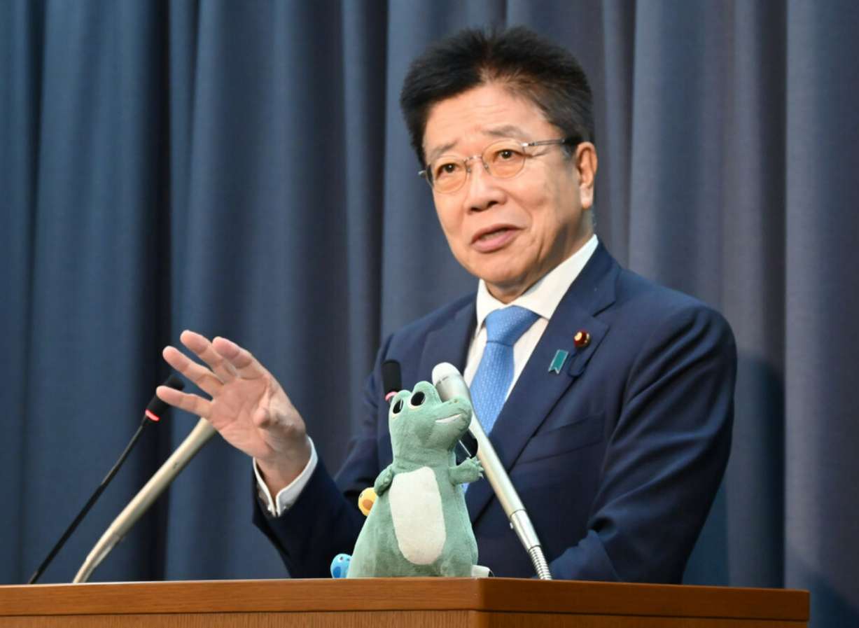 正在就日美财长联合声明举行记者会的日本财务大臣加藤胜信 图源:时事通信社