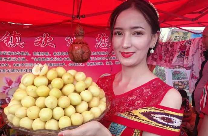库车市每年举行小白杏采摘节庆活动,当地民众展示小白杏。(图/中新社微信公众号)