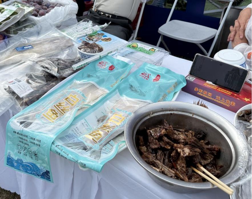 9月23日,位于湖北省武汉市东西湖柏泉街的武汉农业集团空港湿地花田现场,当天现场举办农民丰收节,不少来自东西湖的农业企业、农户带着自己特色产品参展。53岁的张满荣带来自己做的柏泉特色腊鱼,她的展台人气十足,不少市民在现场选购、品尝。