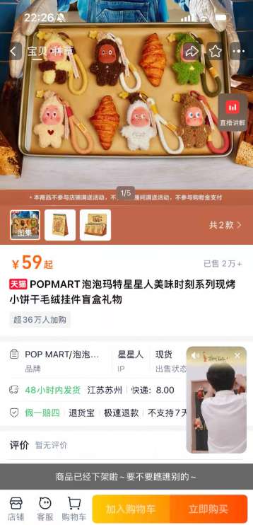 但与此前发布的迷你版LABUBU相比,星星人新系列的备货大幅减少。正式开售后,两款星星人系列产品均为秒空。开售十分钟后,天猫页面信息显示,小饼干毛绒挂件有超36万人加购,但首批天猫官方旗舰店放货仅2万+件,手办盲盒玩具摆件显示已售3万+。此前,迷你版LABUBU开售当晚显示已售30万+件。