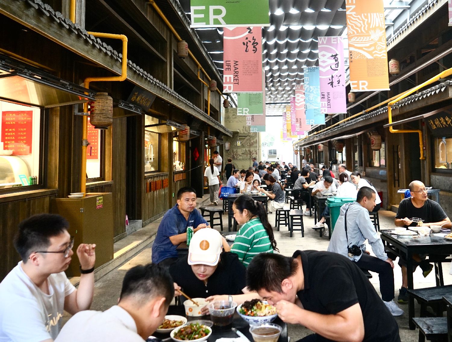 中国国庆中秋假期期间,食客在文二菜市的长廊里用餐。(图/中新社)