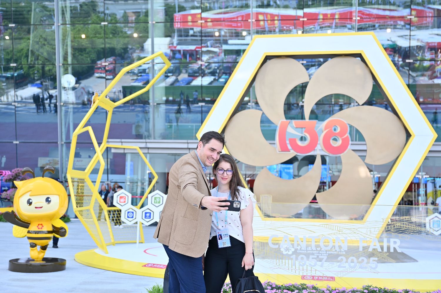 10月15日,第138届中国进出口商品交易会(广交会)在广东广州开幕。据了解,本届广交会以“向智向新向绿”为主题,于10月15日至11月4日分三期举行,展览面积达155万平方米,展位总数7.46万个,参展企业超3.2万家,均创历史新高。图为境外采购商在广交会展馆合影。(中新社)