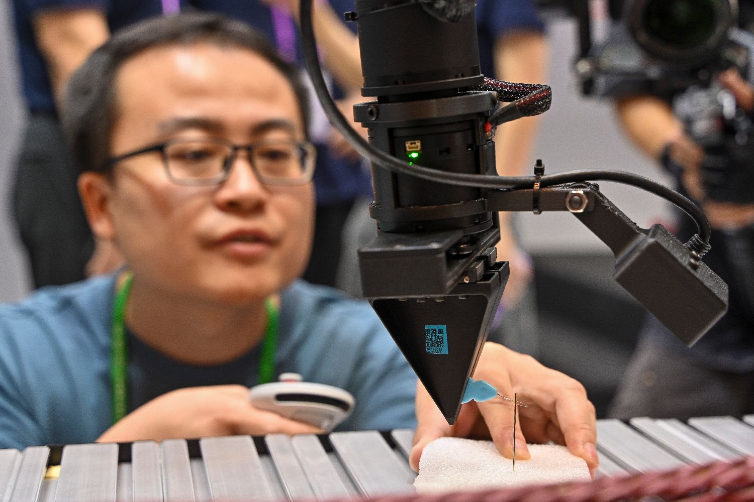 本届广交会第一期以“先进制造”为主题,设立服务机器人专区,聚焦服务机器人前沿,集中展示中国服务机器人最新发展成果。图为10月15日,参展商操控智能柔性机械臂穿针。(中新社)