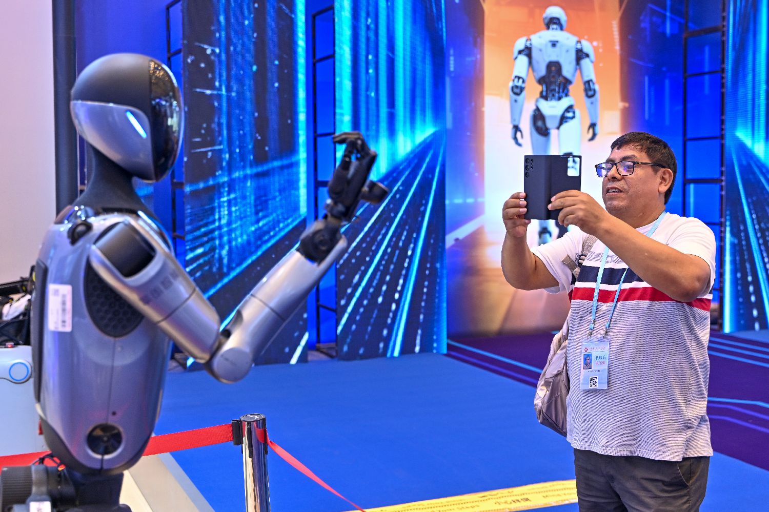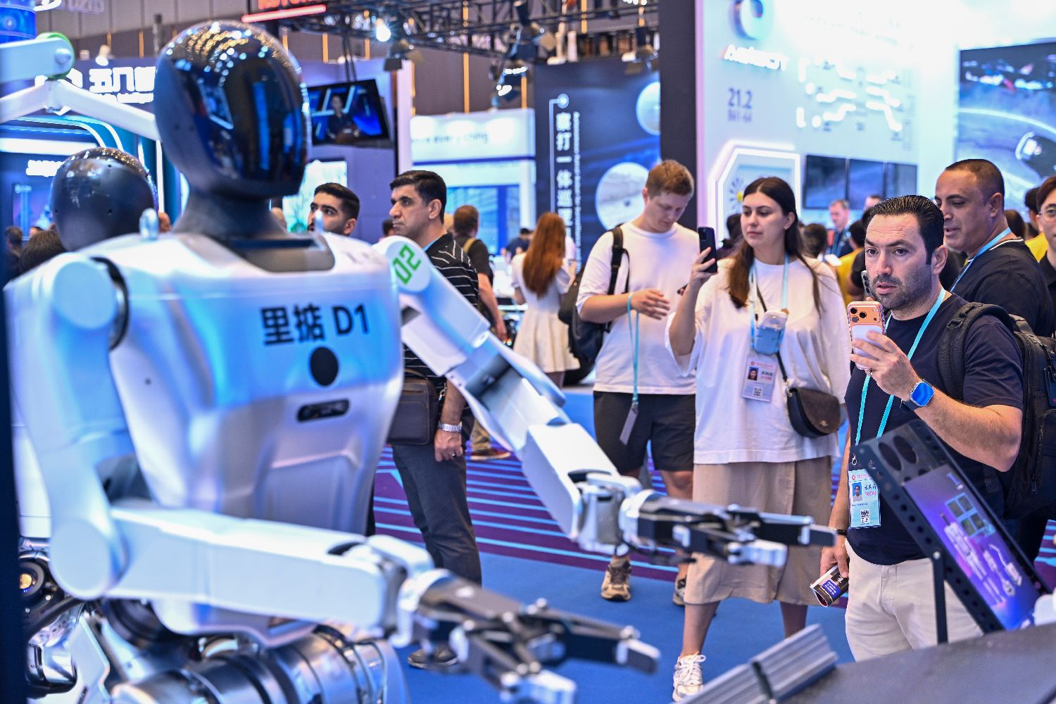 10月15日,一款人形机器人吸引采购商。(中新社)