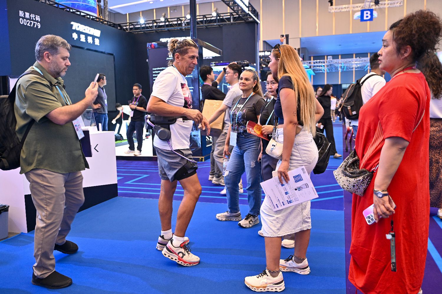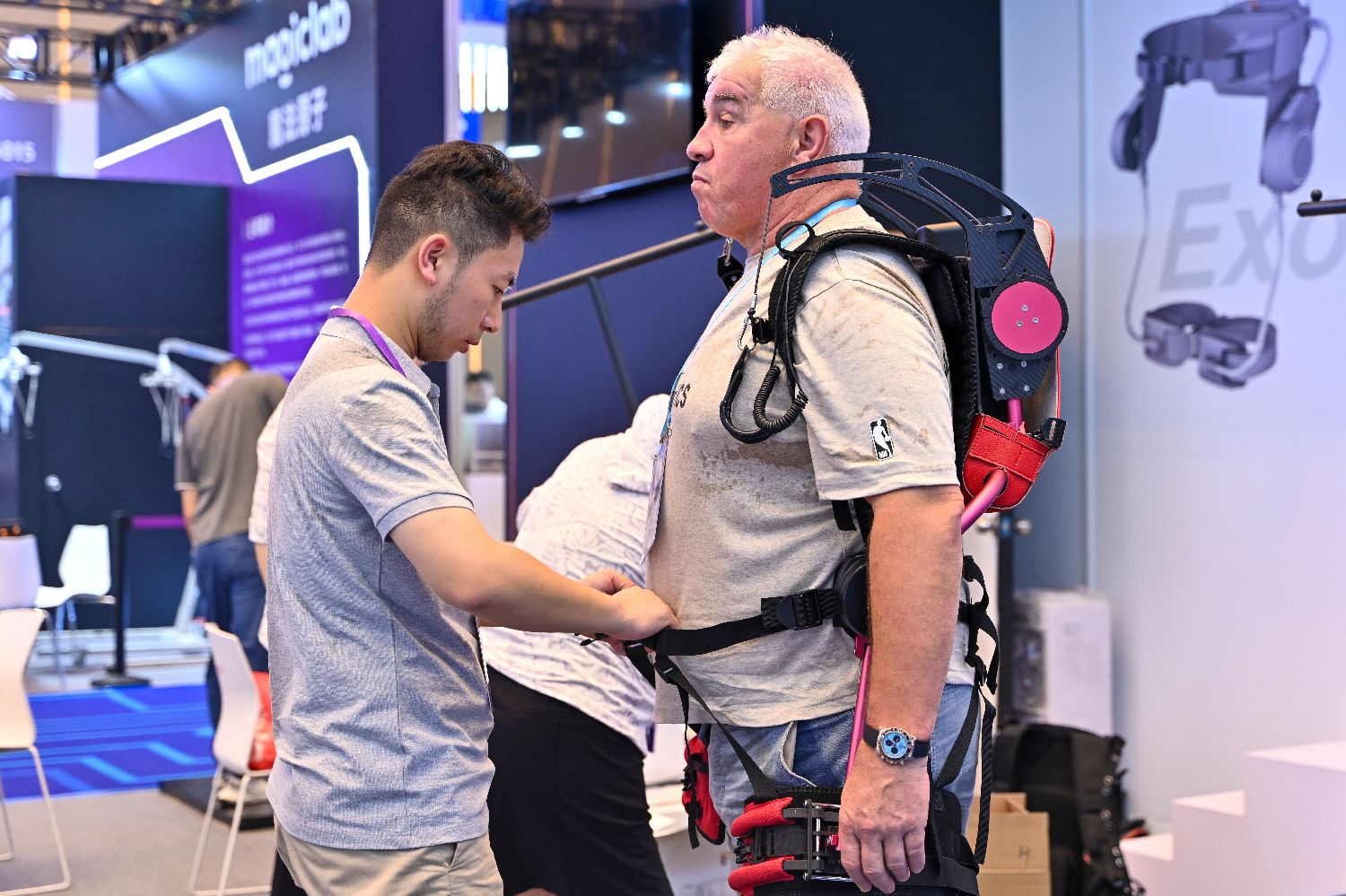 10月15日,采购商体验一款外骨骼助力设备。(中新网)