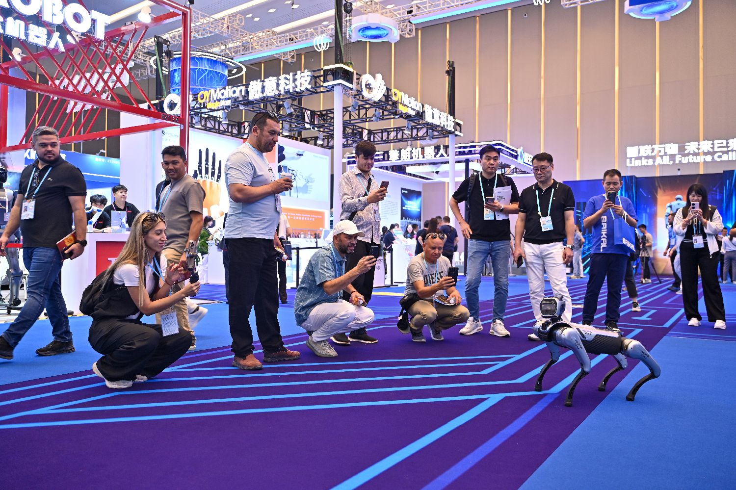 10月15日,广交会琶洲展馆,机器狗披挂上阵一起舞动,现场吸引许多观众关注。(广州日报新花城)