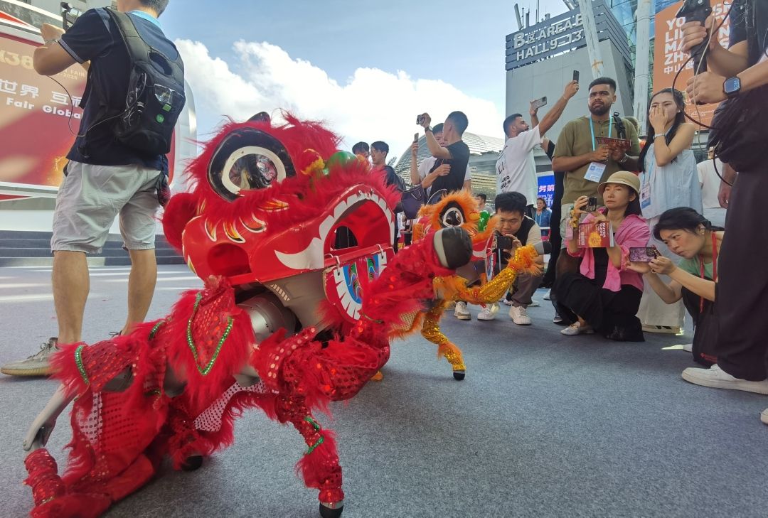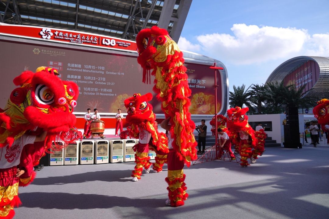 10月15日,广交会琶洲展馆内热火朝天地举行了开馆庆贺活动,开展了热闹的舞龙舞狮非遗文化表演。图为舞狮非遗文化表演。(广州日报新花城)