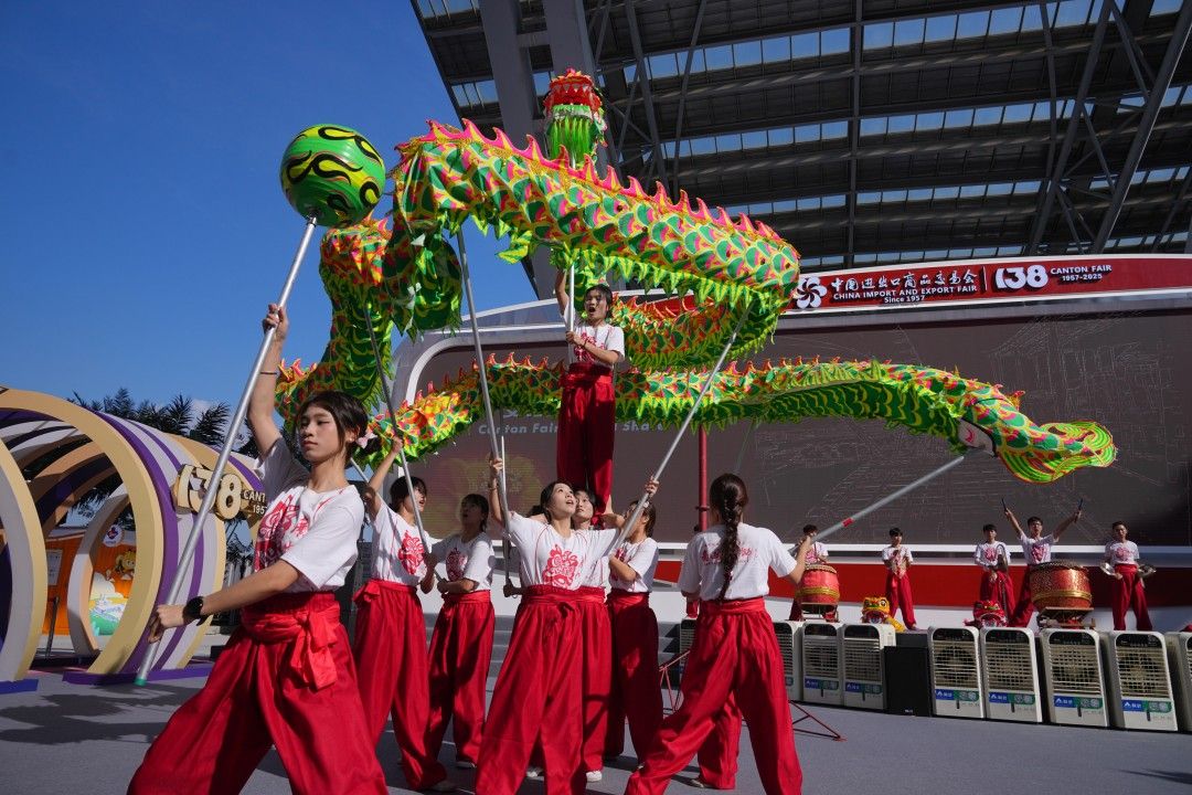 10月15日,广交会琶洲展馆内热火朝天地举行了开馆庆贺活动,开展了热闹的舞龙舞狮非遗文化表演。图为舞龙非遗文化表演。(广州日报新花城)
