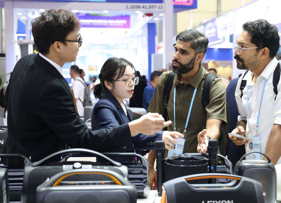 10月15日,客商在广交会上咨询了解音箱产品。(新华社)