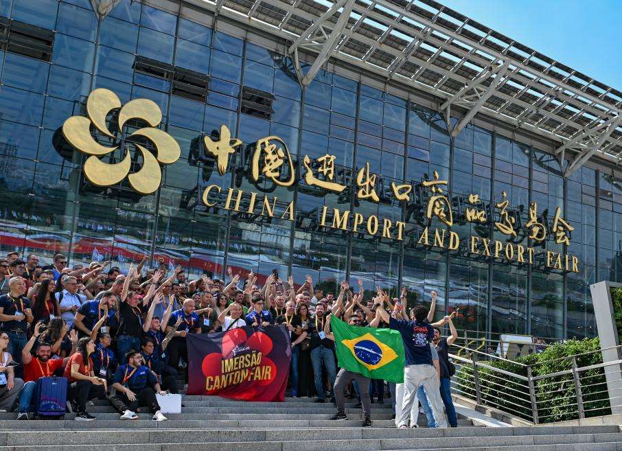 10月15日,客商团体在广交会门口合影留念。(新华社)