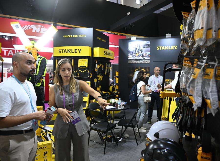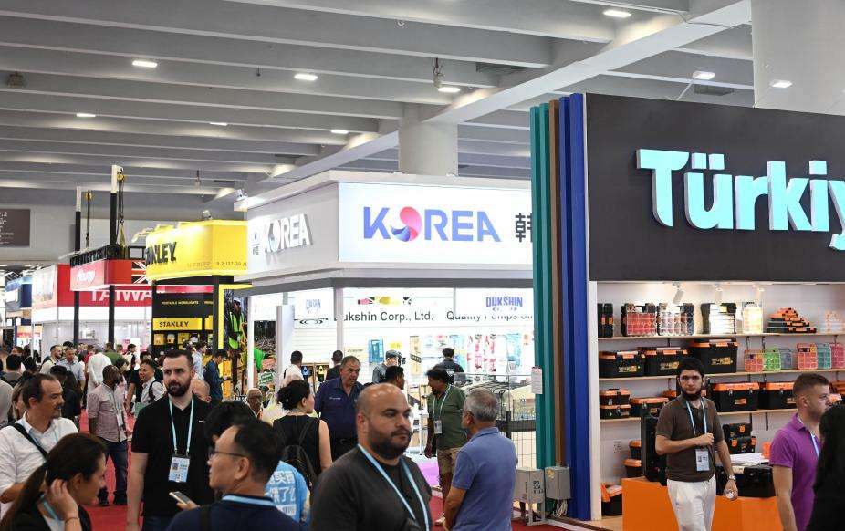 10月15日,在广交会进口展区,境外采购商(左)在美国公司史丹利展区参观。(新华社)