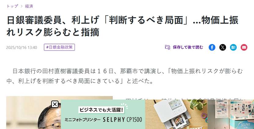 另据日本读卖新闻报道称,田村直树在16日的演讲中说,在物价上涨风险加剧的情况下,已进入判断是否应加息的局面。他还指出,尽管食品价格暂时上涨,但仍有可能出现一轮全面的、较高的价格上涨。