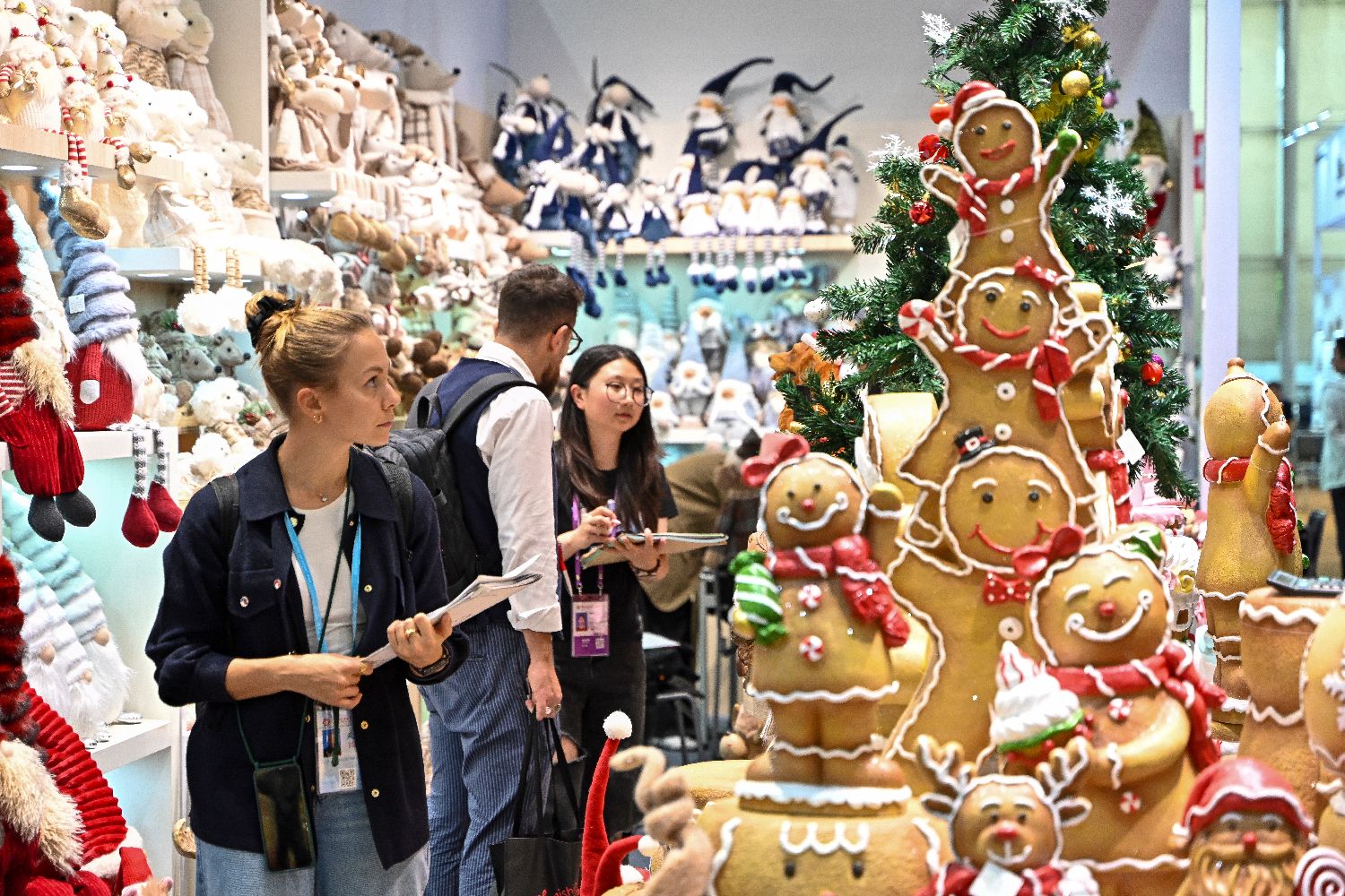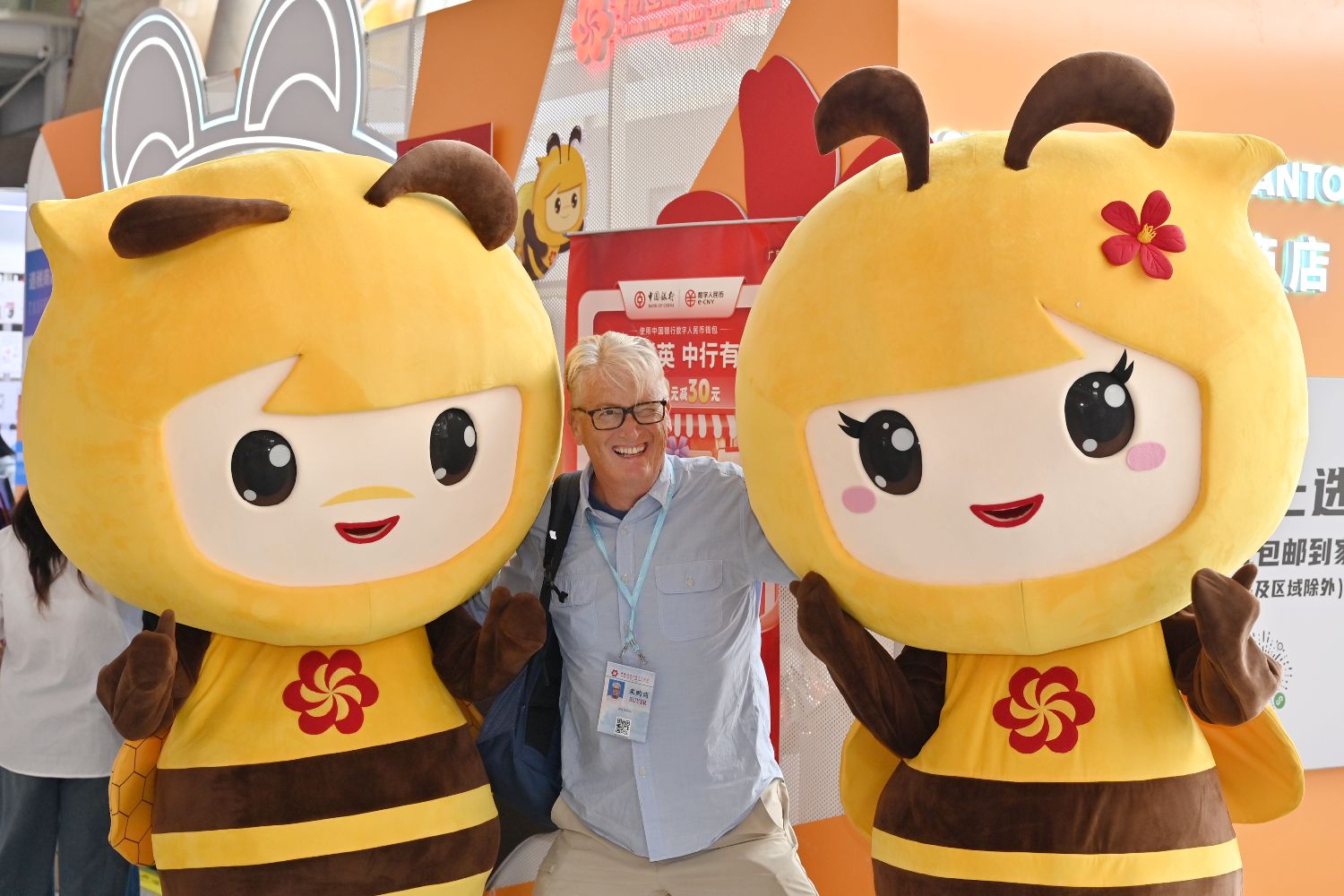 10月23日,第138届中国进出口商品交易会(广交会)第二期开展迎客。本届广交会第二期以“品质家居”为主题,展览面积51.5万平方米,展位约2.5万个,集中展示家庭用品、礼品及装饰品、建材及家具3大板块15个展区,参展企业超1万家。图为境外采购商和广交会吉祥物合影。(中新社)