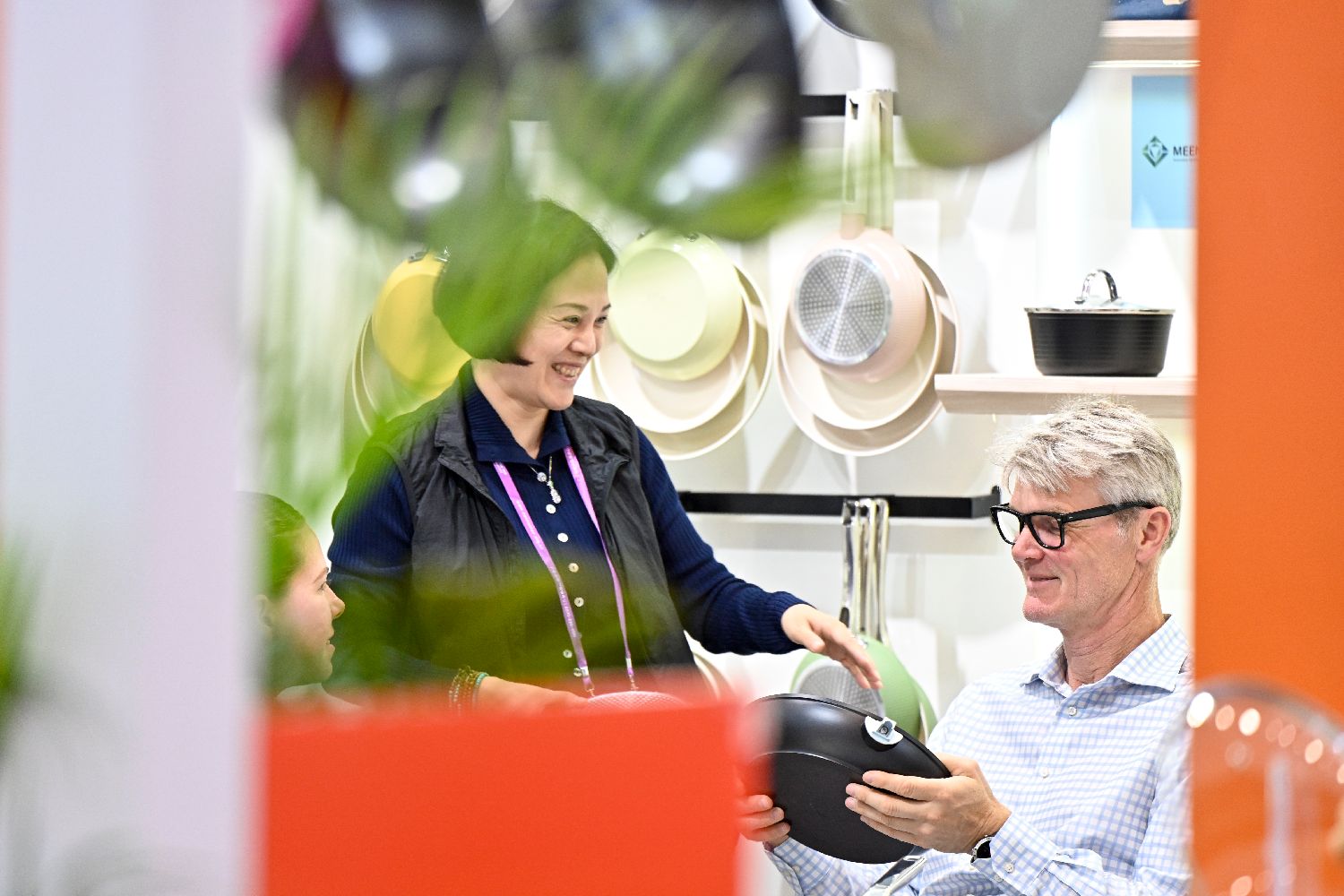图为餐厨用具参展商与采购商(右)洽谈。(中新社)