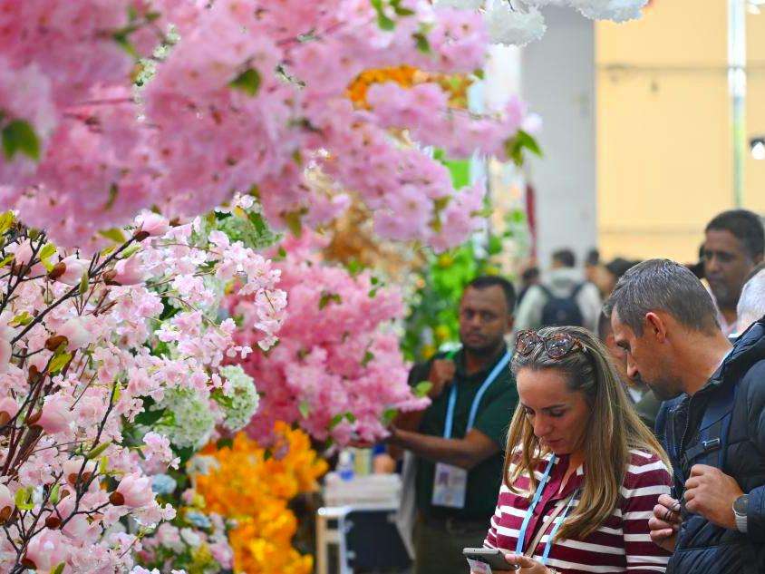 图为境外采购商观看仿真花展台。(新华社)