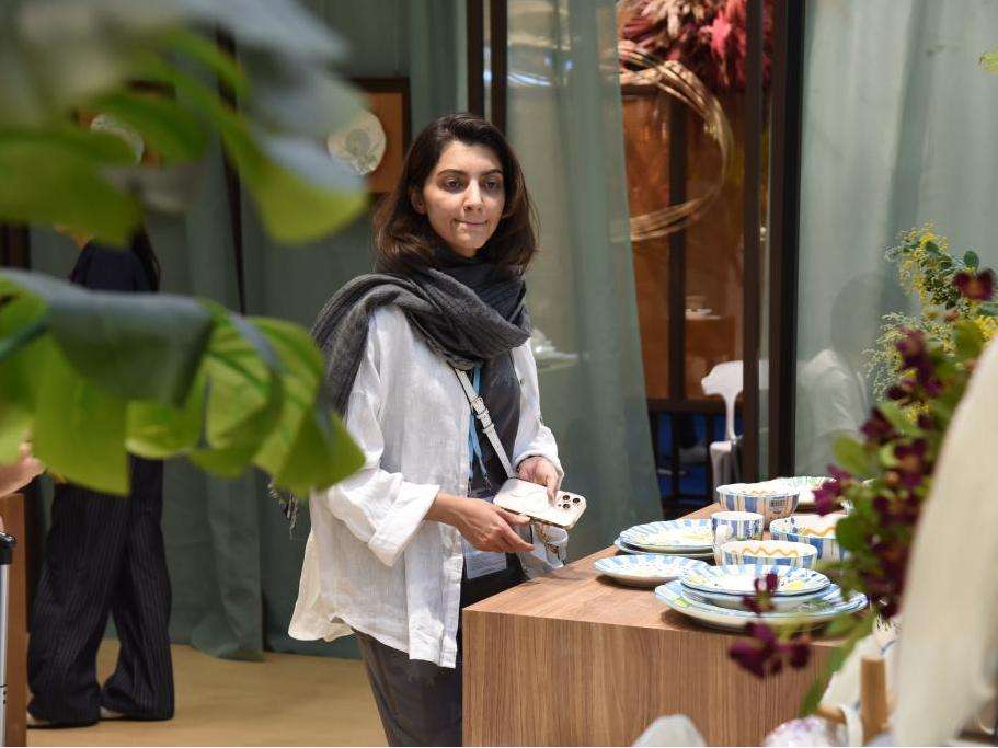 图为采购商在工艺陶瓷展区挑选产品。(中新社)