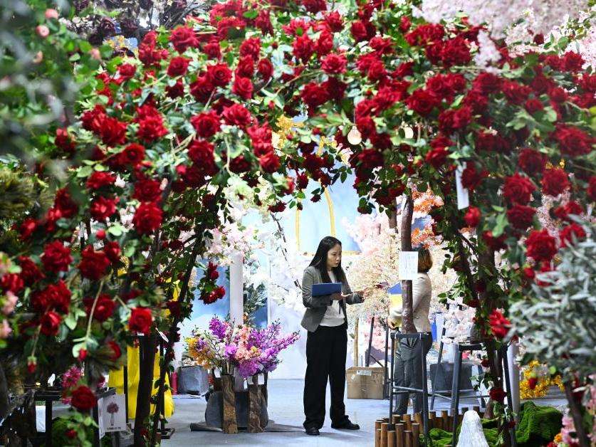 图为工作人员在仿真花展台洽谈。(新华社)
