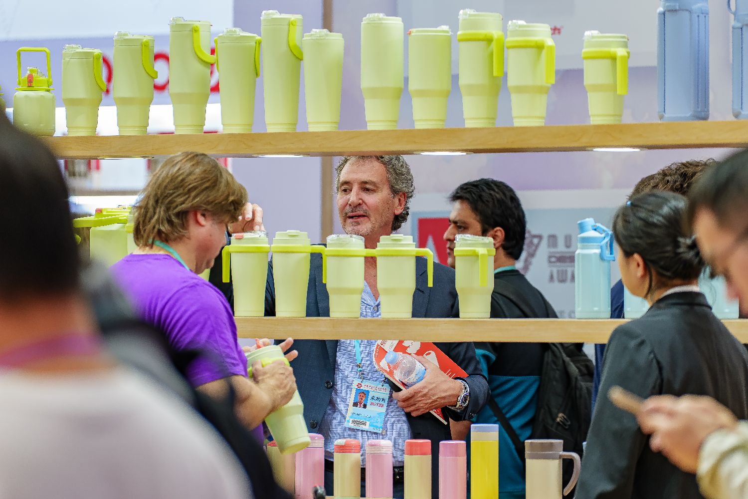 图为厨具展区内,一家参展企业展示的商品吸引采购商驻足。(CFP)